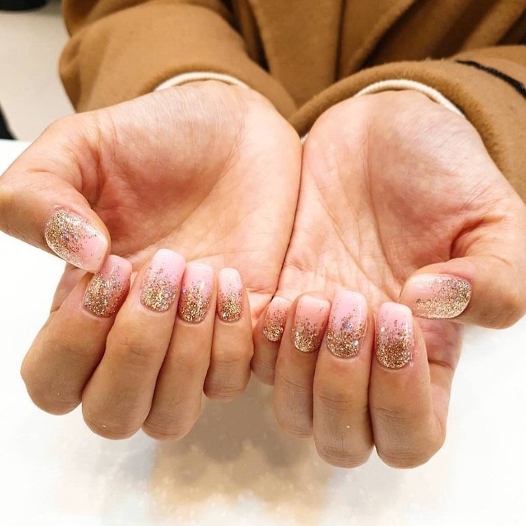 손끝까지 여성미 넘치는 스타일로 루놀라 골드 글리터 포인트로 고급스러운 느낌의 네일입니다. 손가락 길어보임과 화려함까지 놓치지 않아용^^