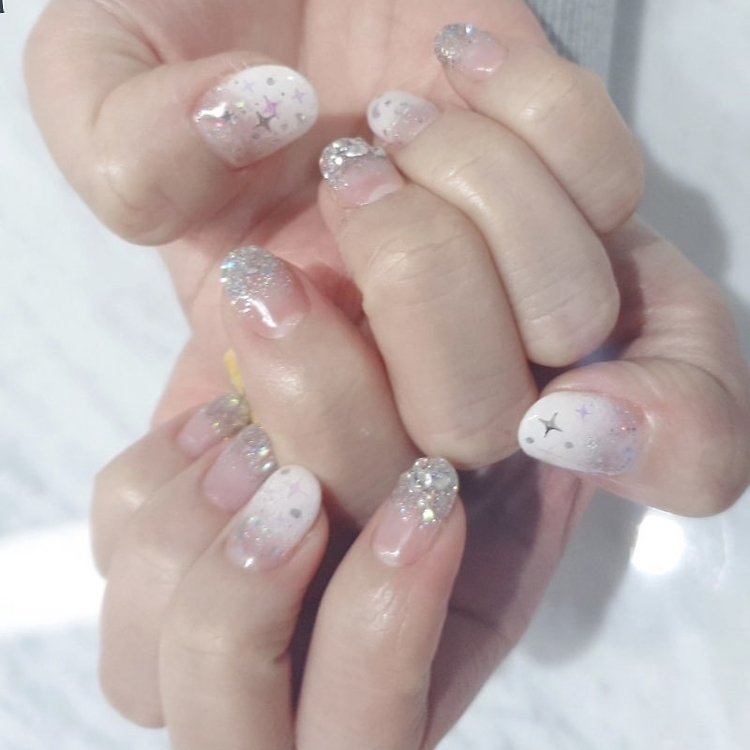 시럼컬러와 펄을 사용하여 그라데이션을 주고 글리터로 포인트로 시술한 아트